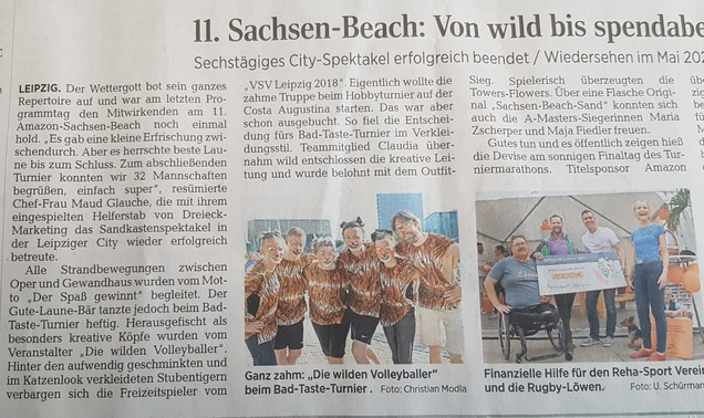 Der Augustusplatz verwandelte sich vom 16.-20. Mai wieder in Leipzigs größten Beachvolleyballplatz. Üblichweise würde unser Verein beim Hobbyliga-Turnier starten, doch die Anmeldungen waren so zahlreich, dass das Turnier sehr schnell ausgebucht war. So "durfte" unsere Mannschaft dieses Mal beim "Bad Taste Turnier" starten, selbstverständlich in Verkleidung, als "Die wilden Volleyballer".